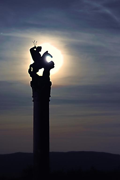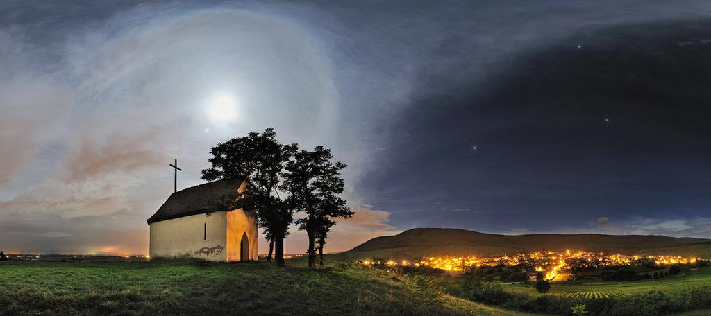 Une image de fin d'été pour clore ce mois d'août. L'action se déroule à la chapelle du Bollenberg, un épisode de temps perturbé vient de passer, la lune est auréolée d'un magnifique halo et Jupiter est toute proche, au-dessus du village d'Orschwihr, le triangle d'été formé par Deneb,Altaïr et Véga se couche, et au loin un orage illumine l'horizon du Jura bâlois ( cliquer sur l'image pour l'agrandir).