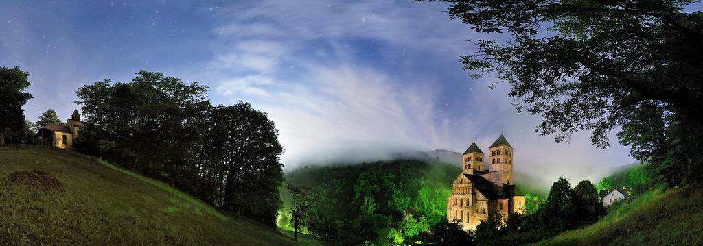 Il a suffit de deux éclairs dans le ciel pour me sortir de mon canapé. Sur la route, une averse calme mon enthousiasme. Las et sous la pluie, je me rends, quand même à l'abbaye de Murbach. J'ai rendez vous avec la chance, car dans la pente en contre-bas de la chapelle de Notre Dame de Lorette, le ciel se dégage, les étoiles apparaissent, la lune éclaire la scène et les brumes évanescentes rendent l'endroit magique .... (cliquer sur l'image pour l'agrandir) :