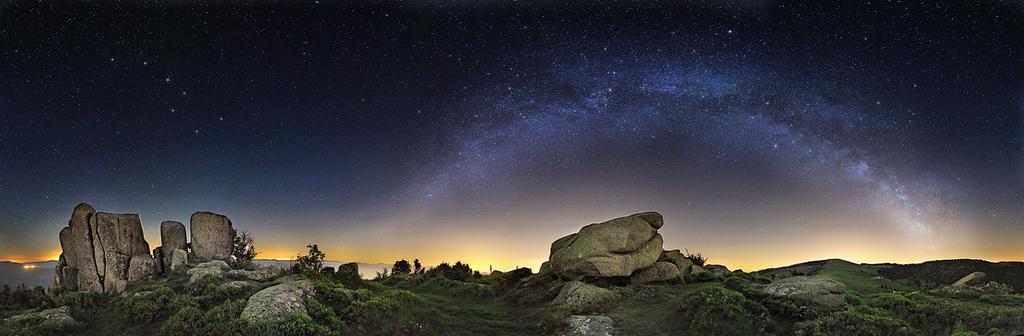 Une image de ce printemps, à cette période, la voie lactée forme une arche presque parfaite au dessus de l'horizon, cette photo panoramique embrasse le paysage du nord au sud. On reconnaît à gauche, au dessus des rochers, la constellation de la grande ourse, le triangle d'été au sommet de l'arche et le noyau brillant à droite, dans le sagittaire, qui correspond au centre de notre galaxie (cliquer sur l'image pour une version agrandie)